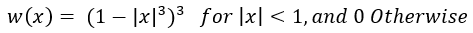 2. Weighting Function: Typically, LOESS uses a weighting function to give different weights to data points based on their distance from the target point being estimated. The weights decrease with distance, making the estimation less sensitive to outliers. A common choice is the tricube weight function, defined as: